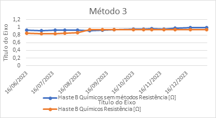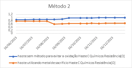 Os métodos 2 e 3 apresentados neste estudo não se mostraram propostas tão eficazes para corrigir os fatores que levam à oxidação. No método 2, no início das medições houve uma diminuição significativa da resistência de aterramento, entretanto, posteriormente, os valores encontrados nas medições se igualaram, ou seja, o sistema não sofreu alterações e as duas hastes – a de cobre e a haste de cobre interligada ao ferro – sofreram oxidação. Ou seja, a utilização do metal de sacrifício não foi capaz de conter a oxidação acelerada do cobre em contato com produtos químicos. No método 3, em que a haste foi isolada com tinta isolante e massa plástica, devido a impossibilidade de isolar a haste da parte abaixo da terra, presume-se que o líquido possa ter penetrado o solo e entrado em contato com o cobre, levando, assim, a oxidação do sistema; dessa forma, a proposição do método 3 não foi capaz de evitar o contato com os líquidos químicos e, consequentemente, minimizar a oxidação acelerada.